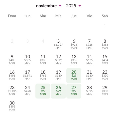 Para finales de noviembre, podrás encontrar vuelos desde $29 pesos (más TUA), comprando ya. Debo aclarar que esta tarifa es la más básica, y no incluye equipaje documentado.