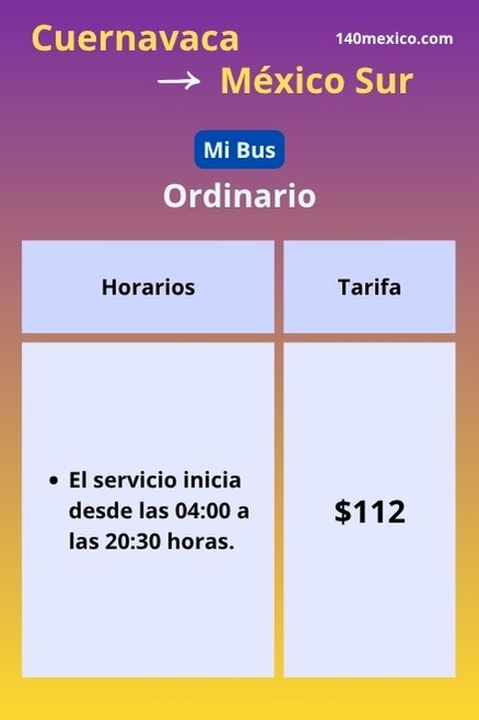 Este es el costo del pasaje y los horarios de los autobuses Mi Bus de Cuernavaca centro a México Central del Sur, para viajar en el 2025.